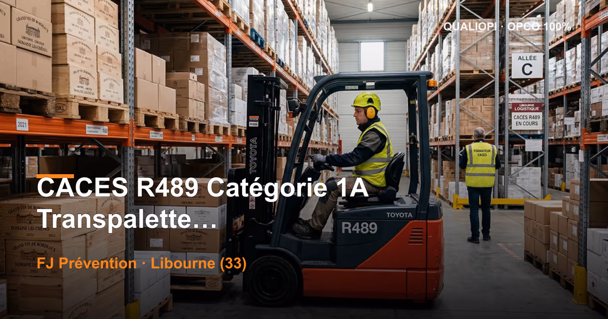 Formez vos opérateurs logistiques libournais au transpalette à conducteur porté — CACES R489 cat 1A délivré par un organisme testeur certifié.