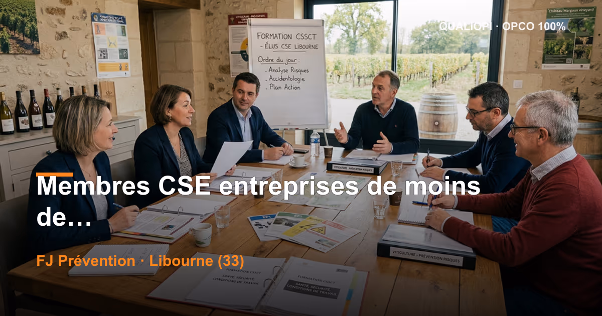 Formez vos élus CSE libournais en PME 11-49 salariés — rôle, missions, SSCT, enquêtes AT, DUERP, droits d'alerte. Pris en charge par l'employeur.