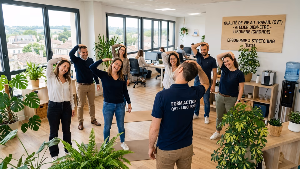 Nos ateliers bien-être au travail à Libourne sont animés par des coachs certifiés en QVT. Programme sur mesure pour les entreprises de Agroalimentaire, BTP et construction, adapté aux enjeux spécifiques du bassin d'emploi de Gironde. À seulement 8 km de notre siège à Saint-Denis-de-Pile, nous intervenons le jour même à Libourne et dans tout le Libournais pour vos formations intra-entreprise.