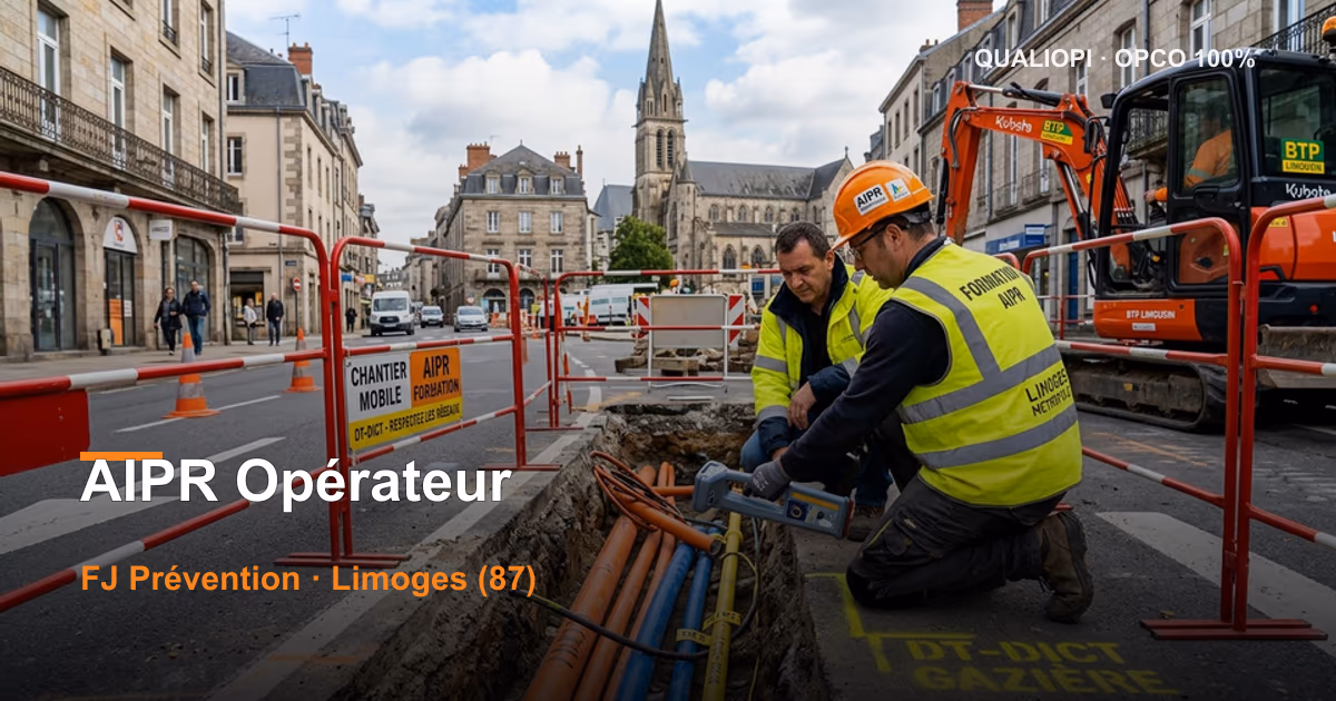 Préparez votre AIPR opérateur à Limoges — 7 h incluant QCM officiel Ineris, cas pratiques sur chantiers VRD limougeauds, attestation 5 ans.
