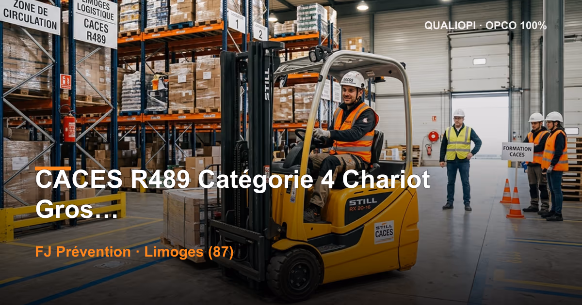 Le cadre légal est celui de tout CACES R489 : article R4323-55 du Code du travail imposant l'autorisation de conduite délivrée par l'employeur, avec la recommandation R489 2020 comme référence professionnelle. Spécificité cat 4 : les donneurs d'ordre industriels lourds (gros sites logistiques, carrières, plateformes portuaires) exigent souvent un engagement formateur indépendant testeur plus explicite que pour le cat 3, en raison de la gravité potentielle des accidents avec chariot de 8 à 10 tonnes (risques d'écrasement, renversement de charge, fauchage piéton).