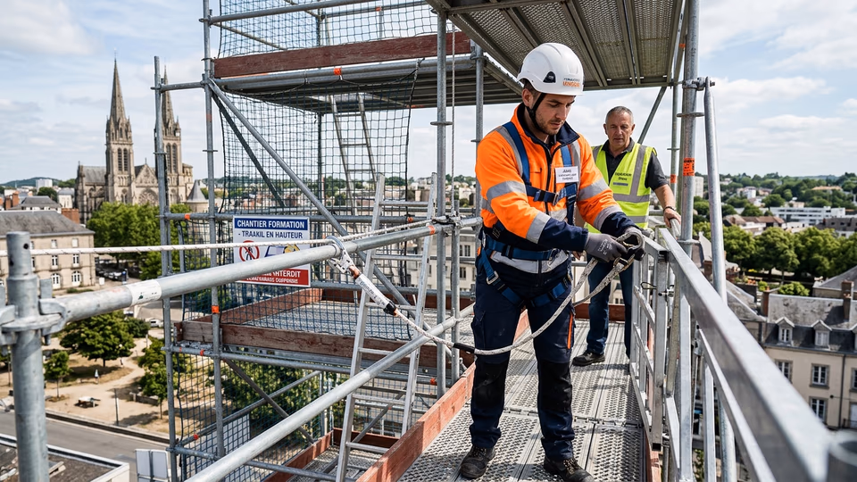 L'article R4323-58 du Code du travail impose une formation adéquate pour tout travailleur utilisant des équipements de travail en hauteur. À Limoges, les entreprises de Agroalimentaire, BTP et génie civil intervenant sur les sites de Parc d'activités Ester Technopole, Parc d'activités de Romanet doivent former leurs équipes au port du harnais et au montage d'échafaudages (R408). Les chutes de hauteur restent la 2e cause de mortalité au travail en France.