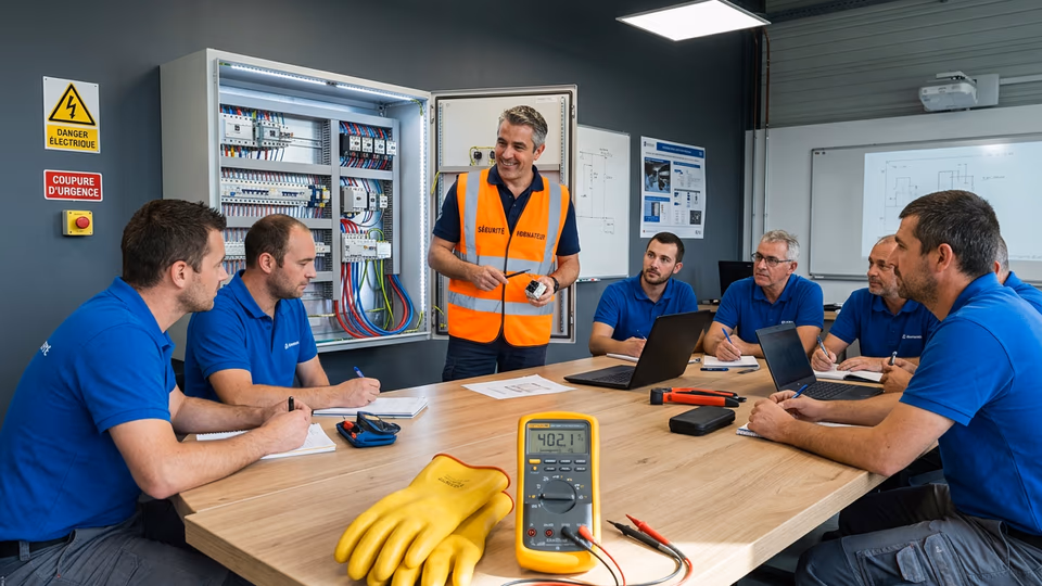 La formation de formateur en habilitation électrique H0B0 BS BP B1 B2 BR prépare les professionnels de l'électrotechnique à concevoir, animer et certifier des formations habilitantes conformément à la norme NFC 18-510. En 5 jours, les participants acquièrent les compétences pédagogiques et réglementaires pour former des électriciens et non-électriciens dans les secteurs du bâtiment, de l'industrie et du tertiaire.