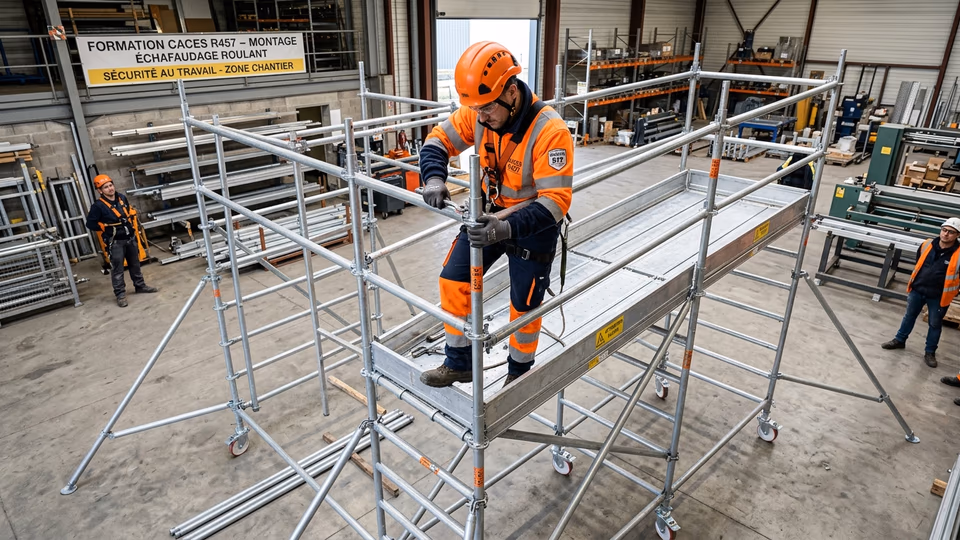 La formation CACES R457 Échafaudage Roulant est une formation d'1 jour (7 heures) qui habilite les travailleurs à monter, utiliser et démonter des échafaudages roulants conformément à la norme EN 1004. L'attestation délivrée est valable 5 ans.