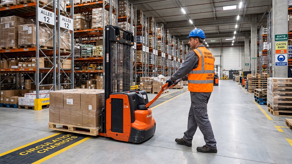 Le CACES R485 est l'autorisation de conduite pour les gerbeurs à conducteur accompagnant. Contrairement aux chariots R489, le conducteur ne monte pas sur l'engin : il l'accompagne à pied et le pilote à l'aide d'un timon. La certification couvre deux catégories : cat. 1 (levée de 1,20 m à 2,50 m) et cat. 2 (levée supérieure à 2,50 m).
